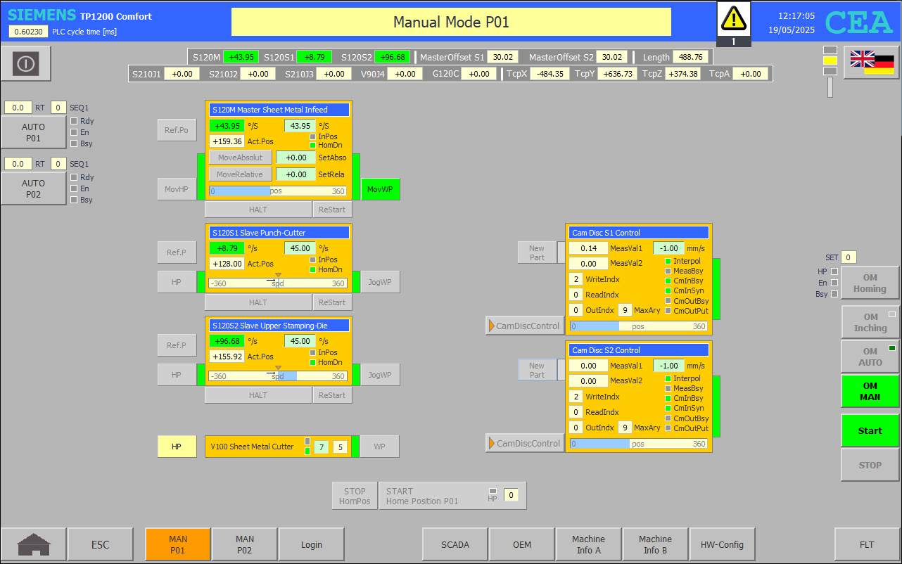 | Network 5: CAM_DISC_S1 Control - enable IF #ST_MANU AND NOT #SUPPORT_SEQ THEN IF "DI MAIN GLB".M00.EntirePlant_Run_Imp THEN #CAM_DISC_S1.ManualVelocity_1 := "DI OUT P01".CAM_DISC_S1.CAM.MC_CamIn.Velocity; END_IF; // Assign velocity manual mode IF "DI OUT P01".CAM_DISC_S1.CAM.MC_CamIn.SyncProfileReference = 0 THEN "DI OUT P01".CAM_DISC_S1.CAM.MC_CamIn.Velocity := #CAM_DISC_S1.ManualVelocity_1; ELSE "DI OUT P01".CAM_DISC_S1.CAM.MC_CamIn.Velocity := #CAM_DISC_S1.ManualVelocity_1 := -1.0; END_IF; END_IF; // Execute start #CAM_DISC_S1.CmdExe_slow_WP := "HMI KEY".P01.CAM_DISC_S1.F10_Execute AND "DI OUT P01".S120M.DRV.Support.LampON AND "DI OUT P01".S120M.DRV.Support.InPos; // Enabling "HMI KEY".P01.CAM_DISC_S1.F11_Enable_HP := NOT "DI OUT P01".CAM_DISC_S1.CAM.MC_CamIn.Busy AND "HMI KEY".P01.CAM_DISC_S1.F12_Enable_WP; "HMI KEY".P01.CAM_DISC_S1.F12_Enable_WP := NOT ("DI OUT P01".CAM_DISC_S1.Common_FLT OR "DI OUT P01".S120S1.Common_FLT); |
