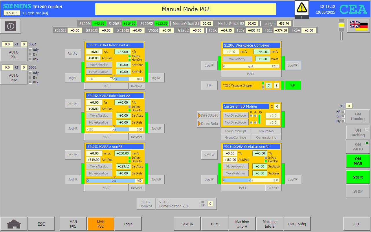 | Network 7: SCARA_3D Robotic Arm - enable // Enabling Kinematics "HMI KEY".P02.SCARA_3D.F8_Enabled := "DI OUT P02".SCARA_3D.KIN.Support.InOperation AND NOT ("DI OUT P02".SCARA_3D.Common_FLT OR "DI MAIN GLB".M00.EntirePlant_STOP_Imp OR "HMI KEY".P02.SCARA_3D.F5_GroupStop); // Stop GroupInterrupt and GroupContinue IF NOT ("DI OUT P02".SCARA_3D.KIN.Support.GroupInterrupt AND "HMI KEY".P02.SCARA_3D.F8_Enabled) THEN #SCARA_3D.Cmd_GroupContinue := #SCARA_3D.Cmd_GroupInterrupt := FALSE; END_IF; // Stop MoveDirectAbsolute IF "DI OUT P02".SCARA_3D.KIN.MC_MoveDirectAbsolute.Done OR NOT "HMI KEY".P02.SCARA_3D.F8_Enabled THEN #SCARA_3D.Cmd_MoveDirectAbsolute := FALSE; END_IF; // Stop MoveDirectRelative IF "DI OUT P02".SCARA_3D.KIN.MC_MoveDirectRelative.Done OR NOT "HMI KEY".P02.SCARA_3D.F8_Enabled THEN #SCARA_3D.Cmd_MoveDirectRelative := FALSE; END_IF; |