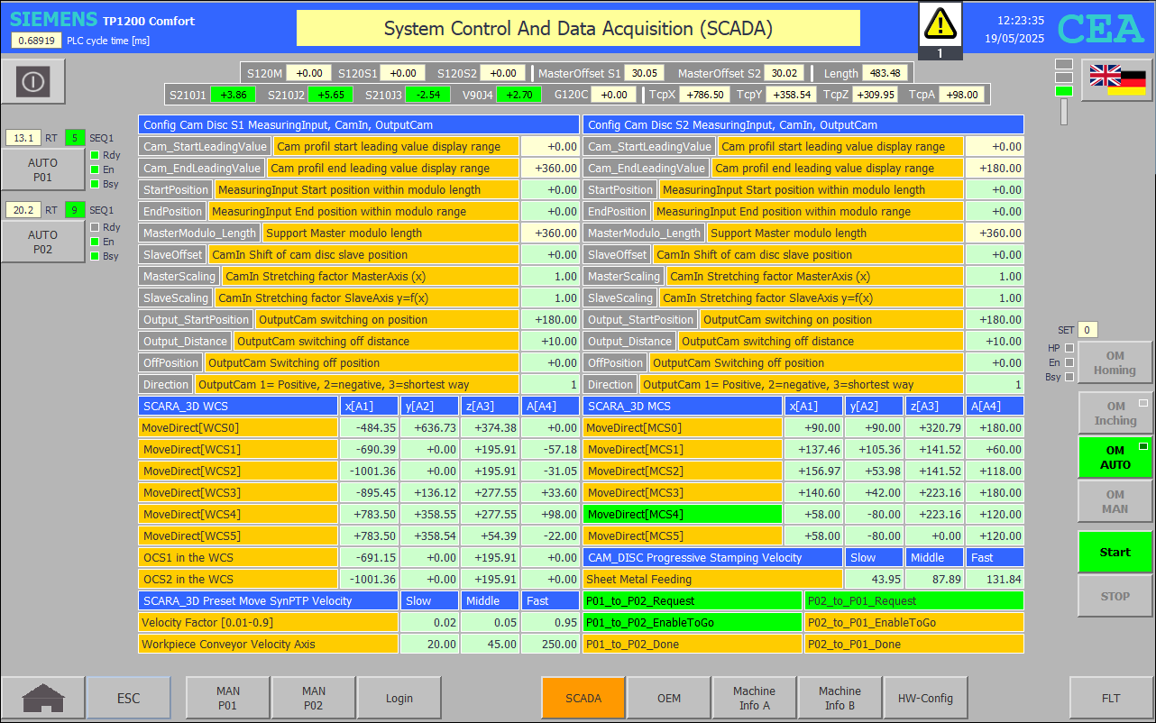 | Network 3: Pre-Setting SCADA Velocity "HMI KEY".Values.SCADA.SCARA_3D_VelocityFactor_Slow := 0.02; "HMI KEY".Values.SCADA.SCARA_3D_VelocityFactor_Middle := 0.05; "HMI KEY".Values.SCADA.SCARA_3D_VelocityFactor_Fast := 0.95; // SCADA_CAM_DISC "HMI KEY".Values.SCADA.CAM_DISC_Velocity_Slow := 43.95; "HMI KEY".Values.SCADA.CAM_DISC_Velocity_Middle := 87.89; "HMI KEY".Values.SCADA.CAM_DISC_Velocity_Fast := 131.84; // SCADA Workpiece Conveyor Velocity Axis "HMI KEY".Values.SCADA.Axis_Velocity_Slow := 20.0; "HMI KEY".Values.SCADA.Axis_Velocity_Middle := 45.0; |