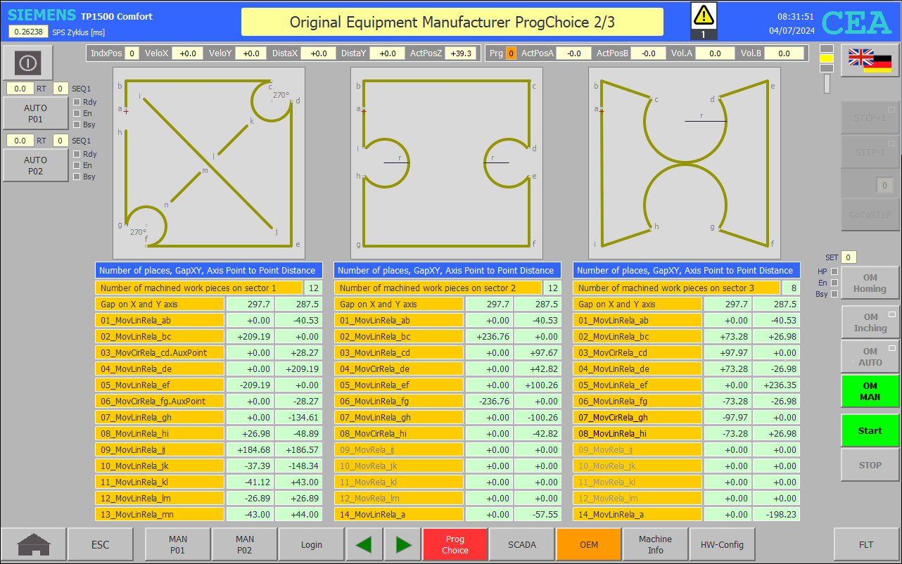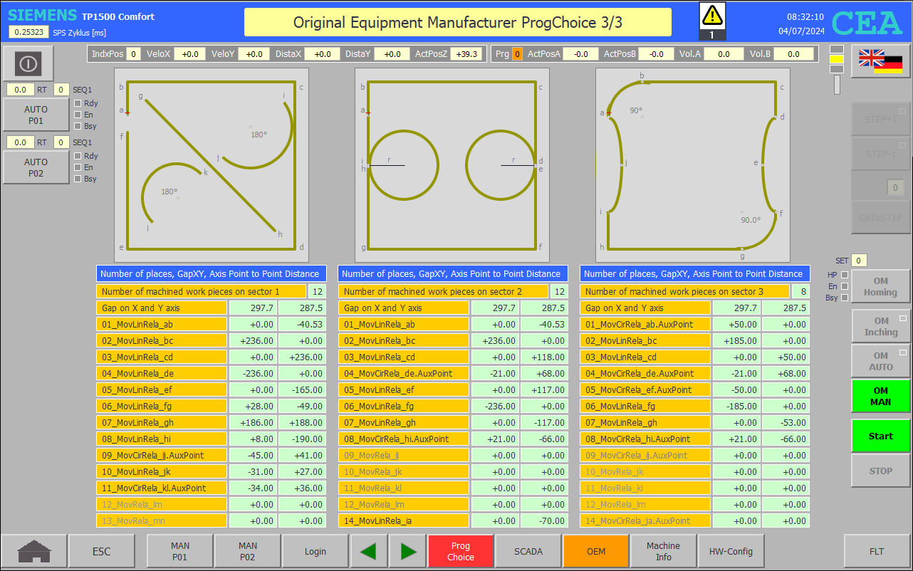 Network 5: Pre-Setting Programme choice 3 work piece carrier 1-3 // Point to Point distance workpiece 1 "HMI KEY".ProgChoice_3.WorkPiece_1.Gap_X := 297.67; "HMI KEY".ProgChoice_3.WorkPiece_1.Gap_Y := 287.53; "HMI KEY".ProgChoice_3.WorkPiece_1.WorkPos_Z := 120.0; "HMI KEY".ProgChoice_3.WorkPiece_1.PalletPlaceOn_X := 8; // pallet fixed places "HMI KEY".ProgChoice_3.WorkPiece_1.PalletPlaceOn_Y := 4; // pallet fixed places "HMI KEY".ProgChoice_3.WorkPiece_1.NumOfWorkPieces := 12; // default "HMI KEY".ProgChoice_3.WorkPiece_1."01_MovRela_ab".Y := -40.53; "HMI KEY".ProgChoice_3.WorkPiece_1."02_MovRela_bc".X := 236.0; "HMI KEY".ProgChoice_3.WorkPiece_1."03_MovRela_cd".Y := 236.0; "HMI KEY".ProgChoice_3.WorkPiece_1."04_MovRela_de".X := -236.0; "HMI KEY".ProgChoice_3.WorkPiece_1."05_MovRela_ef".Y := -165.0; "HMI KEY".ProgChoice_3.WorkPiece_1."06_MovRela_fg".X := 28.0; "HMI KEY".ProgChoice_3.WorkPiece_1."06_MovRela_fg".Y := -49.0; "HMI KEY".ProgChoice_3.WorkPiece_1."07_MovRela_gh".X := 186.0; "HMI KEY".ProgChoice_3.WorkPiece_1."07_MovRela_gh".Y := 188.0; "HMI KEY".ProgChoice_3.WorkPiece_1."08_MovRela_hi".X := 8.0; "HMI KEY".ProgChoice_3.WorkPiece_1."08_MovRela_hi".Y := -190.0; "HMI KEY".ProgChoice_3.WorkPiece_1."09_MovRela_ij".AuxPoint[1] := -45.0; "HMI KEY".ProgChoice_3.WorkPiece_1."09_MovRela_ij".AuxPoint[2] := 41.0; "HMI KEY".ProgChoice_3.WorkPiece_1."09_MovRela_ij".Arc := 180.0; "HMI KEY".ProgChoice_3.WorkPiece_1."09_MovRela_ij".CircMode := 1; "HMI KEY".ProgChoice_3.WorkPiece_1."09_MovRela_ij".PathChoice := 0; // cw "HMI KEY".ProgChoice_3.WorkPiece_1."10_MovRela_jk".X := -31.0; "HMI KEY".ProgChoice_3.WorkPiece_1."10_MovRela_jk".Y := 27.0; "HMI KEY".ProgChoice_3.WorkPiece_1."11_MovRela_kl".AuxPoint[1] := -34; "HMI KEY".ProgChoice_3.WorkPiece_1."11_MovRela_kl".AuxPoint[2] := 36.0; "HMI KEY".ProgChoice_3.WorkPiece_1."11_MovRela_kl".Arc := 180.0; "HMI KEY".ProgChoice_3.WorkPiece_1."11_MovRela_kl".CircMode := 1; "HMI KEY".ProgChoice_3.WorkPiece_1."11_MovRela_kl".PathChoice := 1; // acw // Point to Point distance workpiece 2 "HMI KEY".ProgChoice_3.WorkPiece_2.Gap_X := 297.67; "HMI KEY".ProgChoice_3.WorkPiece_2.Gap_Y := 287.53; "HMI KEY".ProgChoice_3.WorkPiece_2.WorkPos_Z := 120.0; "HMI KEY".ProgChoice_3.WorkPiece_2.PalletPlaceOn_X := 8; // pallet fixed places "HMI KEY".ProgChoice_3.WorkPiece_2.PalletPlaceOn_Y := 4; // pallet fixed places "HMI KEY".ProgChoice_3.WorkPiece_2.NumOfWorkPieces := 12; // default "HMI KEY".ProgChoice_3.WorkPiece_2."01_MovRela_ab".Y := -40.53; "HMI KEY".ProgChoice_3.WorkPiece_2."02_MovRela_bc".X := 236.0; "HMI KEY".ProgChoice_3.WorkPiece_2."03_MovRela_cd".Y := 118.0; "HMI KEY".ProgChoice_3.WorkPiece_2."04_MovRela_de".Y := 1.0; // EndPoint CircMode_2,r=50.0,PatChoice=3/acw "HMI KEY".ProgChoice_3.WorkPiece_2."04_MovRela_de".CircMode := 2; "HMI KEY".ProgChoice_3.WorkPiece_2."04_MovRela_de".Radius := 50.0; "HMI KEY".ProgChoice_3.WorkPiece_2."04_MovRela_de".PathChoice := 3; // acw "HMI KEY".ProgChoice_3.WorkPiece_2."05_MovRela_ef".Y := 117.0; "HMI KEY".ProgChoice_3.WorkPiece_2."06_MovRela_fg".X := -236.0; "HMI KEY".ProgChoice_3.WorkPiece_2."07_MovRela_gh".Y := -117.0; "HMI KEY".ProgChoice_3.WorkPiece_2."08_MovRela_hi".Y := -1.0; // EndPoint CircMode_2,r=50.0,PathChoice=3/acw "HMI KEY".ProgChoice_3.WorkPiece_2."08_MovRela_hi".CircMode := 2; "HMI KEY".ProgChoice_3.WorkPiece_2."08_MovRela_hi".Radius := 50.0; "HMI KEY".ProgChoice_3.WorkPiece_2."08_MovRela_hi".PathChoice := 3; // acw "HMI KEY".ProgChoice_3.WorkPiece_2."14_MovRela_a".Y := -70.0; // Point to Point distance workpiece 3 "HMI KEY".ProgChoice_3.WorkPiece_3.Gap_X := 297.67; "HMI KEY".ProgChoice_3.WorkPiece_3.Gap_Y := 287.53; "HMI KEY".ProgChoice_3.WorkPiece_3.WorkPos_Z := 120.0; "HMI KEY".ProgChoice_3.WorkPiece_3.PalletPlaceOn_X := 8; // pallet fixed places "HMI KEY".ProgChoice_3.WorkPiece_3.PalletPlaceOn_Y := 4; // pallet fixed places "HMI KEY".ProgChoice_3.WorkPiece_3.NumOfWorkPieces := 8; // default "HMI KEY".ProgChoice_3.WorkPiece_3."01_MovRela_ab".AuxPoint[1] := 50.0; // CircMode_1, AuxPoint+Arc "HMI KEY".ProgChoice_3.WorkPiece_3."01_MovRela_ab".Arc := 90.0; "HMI KEY".ProgChoice_3.WorkPiece_3."01_MovRela_ab".CircMode := 1; "HMI KEY".ProgChoice_3.WorkPiece_3."01_MovRela_ab".PathChoice := 0; // cw "HMI KEY".ProgChoice_3.WorkPiece_3."02_MovRela_bc".X := 185.0; "HMI KEY".ProgChoice_3.WorkPiece_3."03_MovRela_cd".Y := 50.0; "HMI KEY".ProgChoice_3.WorkPiece_3."04_MovRela_de".AuxPoint[1] := -21.0; // CircMode_0, AuxPoint "HMI KEY".ProgChoice_3.WorkPiece_3."04_MovRela_de".AuxPoint[2] := 68.0; // CircMode_0, AuxPoint "HMI KEY".ProgChoice_3.WorkPiece_3."04_MovRela_de".Y := 136.0; // EndPoint "HMI KEY".ProgChoice_3.WorkPiece_3."04_MovRela_de".CircMode := 0; "HMI KEY".ProgChoice_3.WorkPiece_3."05_MovRela_ef".AuxPoint[1] := -50.0; // CircMode_1, AuxPoint+Arc/cw "HMI KEY".ProgChoice_3.WorkPiece_3."05_MovRela_ef".Arc := 90.0; "HMI KEY".ProgChoice_3.WorkPiece_3."05_MovRela_ef".CircMode := 1; "HMI KEY".ProgChoice_3.WorkPiece_3."05_MovRela_ef".PathChoice := 0; // cw "HMI KEY".ProgChoice_3.WorkPiece_3."06_MovRela_fg".X := -185.0; "HMI KEY".ProgChoice_3.WorkPiece_3."07_MovRela_gh".Y := -53.0; "HMI KEY".ProgChoice_3.WorkPiece_3."08_MovRela_hi".AuxPoint[1] := 21.0; // CircMode_0, AuxPoint "HMI KEY".ProgChoice_3.WorkPiece_3."08_MovRela_hi".AuxPoint[2] := -66.0; // CircMode_0, AuxPoint "HMI KEY".ProgChoice_3.WorkPiece_3."08_MovRela_hi".Y := -133.0; // CircMode_0, EndPoint "HMI KEY".ProgChoice_3.WorkPiece_3."08_MovRela_hi".CircMode := 0; // Assign Velocity per-Setting programme choice 3 "HMI KEY".ProgChoice_3.WorkPiece_1.Velocity_3D := 50.0; // mm/s "HMI KEY".ProgChoice_3.WorkPiece_1.WorkVelo_X := 50.0; // mm/s "HMI KEY".ProgChoice_3.WorkPiece_1.WorkVelo_Y := 50.0; // mm/s "HMI KEY".ProgChoice_3.WorkPiece_1.RapidVelo_X := 100.0; "HMI KEY".ProgChoice_3.WorkPiece_1.RapidVelo_Y := 100.0; "HMI KEY".ProgChoice_3.WorkPiece_1.WorkVelo_Z := 30.0; "HMI KEY".ProgChoice_3.WorkPiece_1.RapidVelo_Z := 90.0; "HMI KEY".ProgChoice_3.WorkPiece_2.Velocity_3D := 50