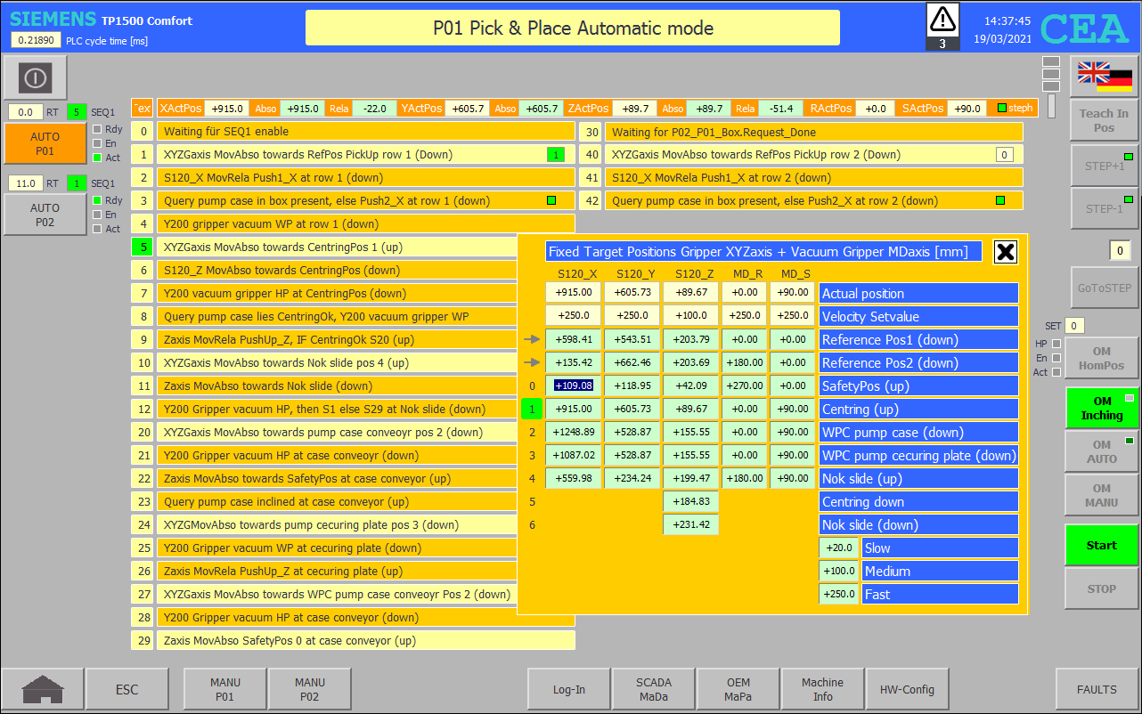 P01 Pick & Place P01 takes care of the box unloading. The box contains a certain number pump cases. When the box is done, P01 gives in S30 P02 enable signal which allow the lift to go down to position where the box is then transferred out. |