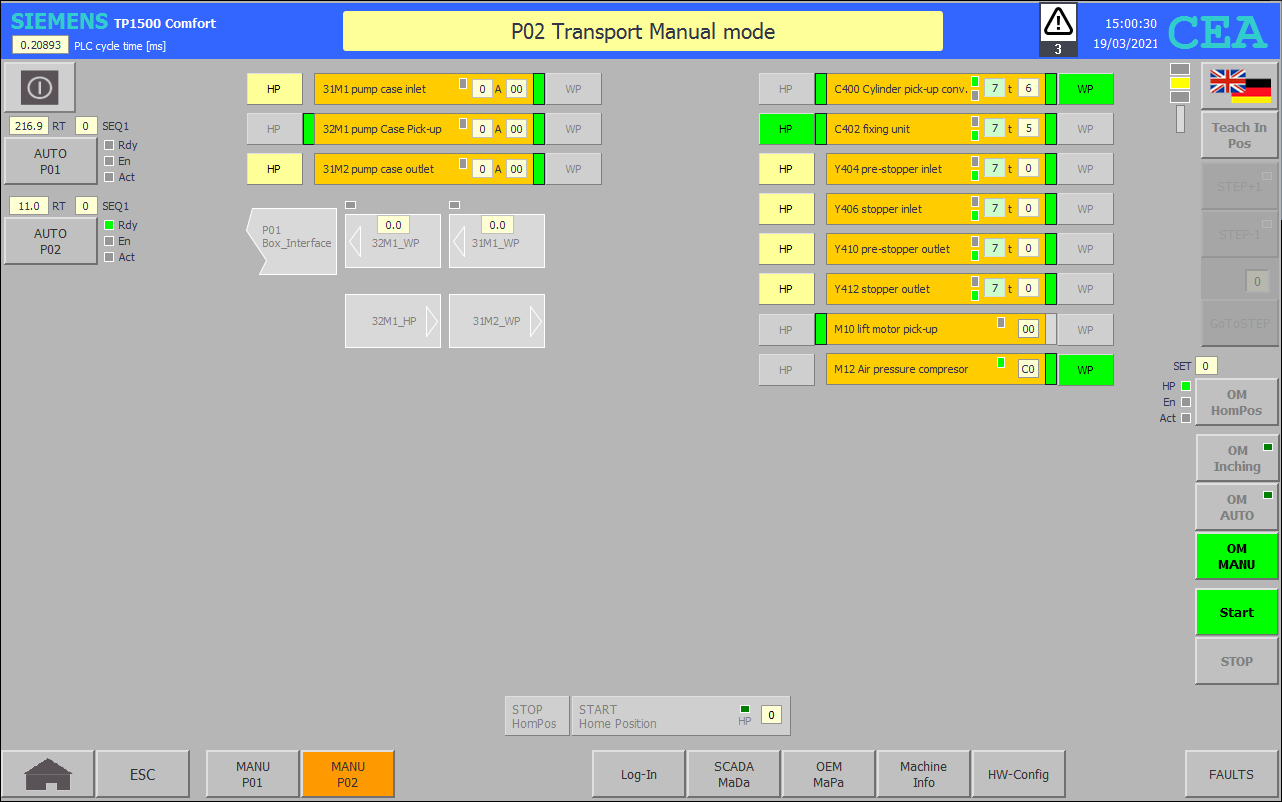 Network 3: 32M1 Pump case box pick-up conveyor - enable "HMI KEY".P02."32M1".F12_Enable_WP := NOT ("DI OUT P02"."32M1".HALT_01 OR "DI OUT P02"."32M1".Com_FLT);