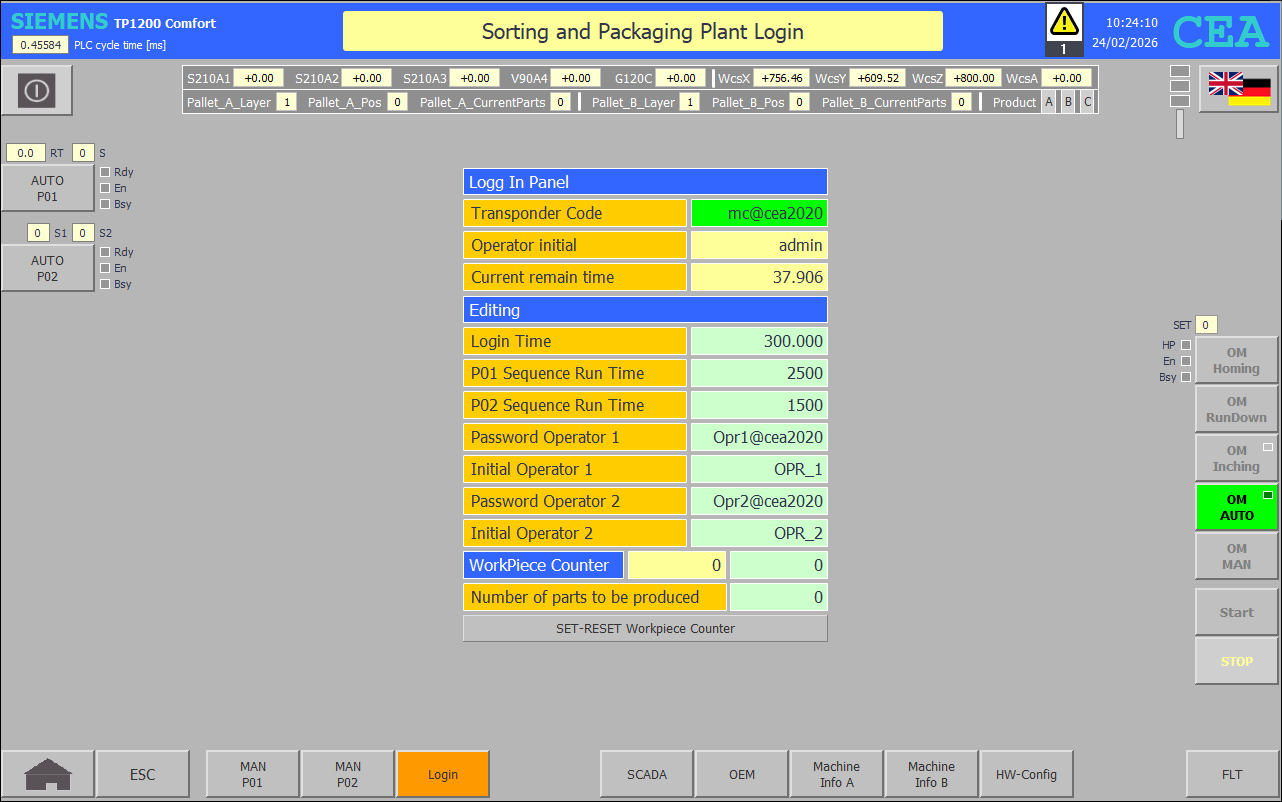 Network 15: LogIn mc@cea2020 IF "HMI SYS".Login.Operator_0.ID = "HMI SYS".Login.Admin.ID THEN "HMI SYS".Login.Operator_0.Initials := "HMI SYS".Login.Admin.Initials; #M00.LogInID_CEA := #M00.LogInID_OK := TRUE; ELSIF "HMI SYS".Login.Operator_0.ID = "HMI SYS".Login.Operator_1.ID THEN "HMI SYS".Login.Operator_0.Initials := "HMI SYS".Login.Operator_1.Initials; #M00.LogInID_OK := TRUE; #M00.LogInID_CEA := FALSE; ELSIF "HMI SYS".Login.Operator_0.ID = "HMI SYS".Login.Operator_2.ID THEN "HMI SYS".Login.Operator_0.Initials := "HMI SYS".Login.Operator_2.Initials; #M00.LogInID_OK := TRUE; #M00.LogInID_CEA := FALSE; ELSE #M00.LogInID_CEA := #M00.LogInID_OK := FALSE; END_IF; IF NOT #M00.LogInID_OK THEN "HMI SYS".Login.Operator_0.Initials := ''; END_IF; #M00.TON_Login(IN := #M00.LogInID_CEA, PT := #M00.TON_Login.PT); IF #M00.TON_Login.Q THEN "HMI SYS".Login.Operator_0.ID := ''; END_IF; |