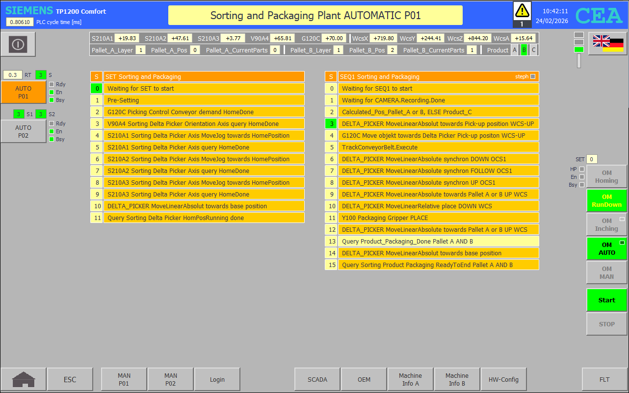 1: // Waiting for CAMERA.Recording.Done IF #SSM.S.stepfc THEN IF "HMI KEY".PlantInfo.Product_Packaging_Done THEN "HMI KEY".PlantInfo.Product_Packaging_Done := FALSE; #Pallet_A_Index_Layer := #Pallet_B_Index_Layer := 1; #Pallet_A_CurrentParts := #Pallet_B_CurrentParts := "DI MAIN P01".M00.ProductCounter.GoodParts := 0; END_IF; "DI MAIN P01".M00.SEQ1_Busy := TRUE; #Pallet_A_Totalparts := "DI OUT P01".Pallet_A.Layer * "DI OUT P01".Pallet_A.Places; #Pallet_B_Totalparts := "DI OUT P01".Pallet_B.Layer * "DI OUT P01".Pallet_B.Places; "DI MAIN P01".M00.ProductCounter.TotalParts := #Pallet_A_Totalparts + #Pallet_B_Totalparts; "DI OUT P01".G120C.DRV.Support.SetVelo := "HMI KEY".PlantInfo.Work_Velocity; #RunTimeCounter := 0; ELSE "DI OUT P01".G120C.DRV.Support.Cmd_MoveJogWP := "HMI KEY".P01.G120C.F12_Enable_WP AND #SSM.S.stepa; #SSM.S.stepd := "DI OUT P01".CAMERA.Recording.Done; "DI OUT P01".CAMERA.CmdExe_ON := NOT #SSM.S.stepd AND "DI OUT P01".G120C.DRV.Support.LampON AND "DI OUT P01".TRACK_CONVEYOR.DRV.MC_MeasuringInput.Execute; END_IF;